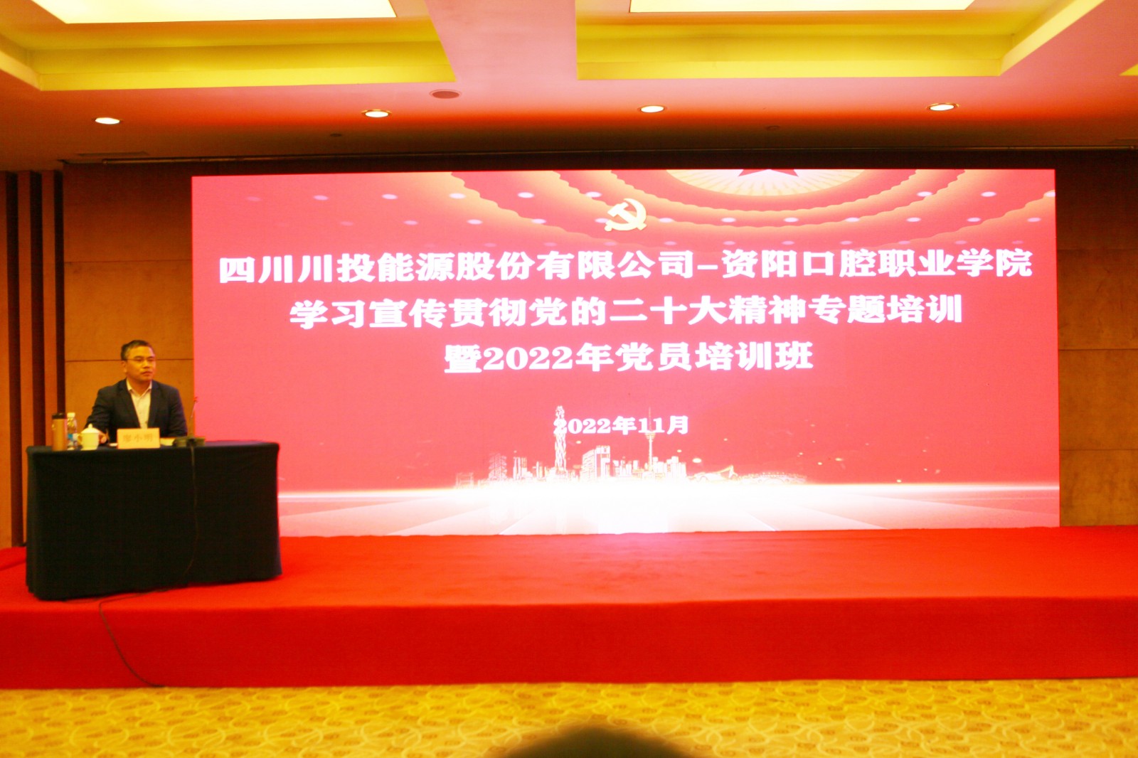 為深入學(xué)習(xí)宣傳貫徹黨的二十大精神,鞏固拓展黨史學(xué)習(xí)教育成果,不斷夯實全體黨員忠誠擁護“兩個確立”、堅決做到“兩個維護”的政治自覺、思想自覺、行動自覺,11月21日-22日,川投能源黨委與資陽口腔職業(yè)學(xué)院黨委共同舉辦學(xué)習(xí)宣傳貫徹黨的二十大精神專題培訓(xùn)暨2022年黨員培訓(xùn)班。川投能源黨委書記、副董事長、總經(jīng)理楊洪出席并授課,資陽口腔職業(yè)學(xué)院黨委書記、理事長張中偉出席并作開班講話,川投能源黨委副書記、工會主席冉蘭平主持開班儀式。