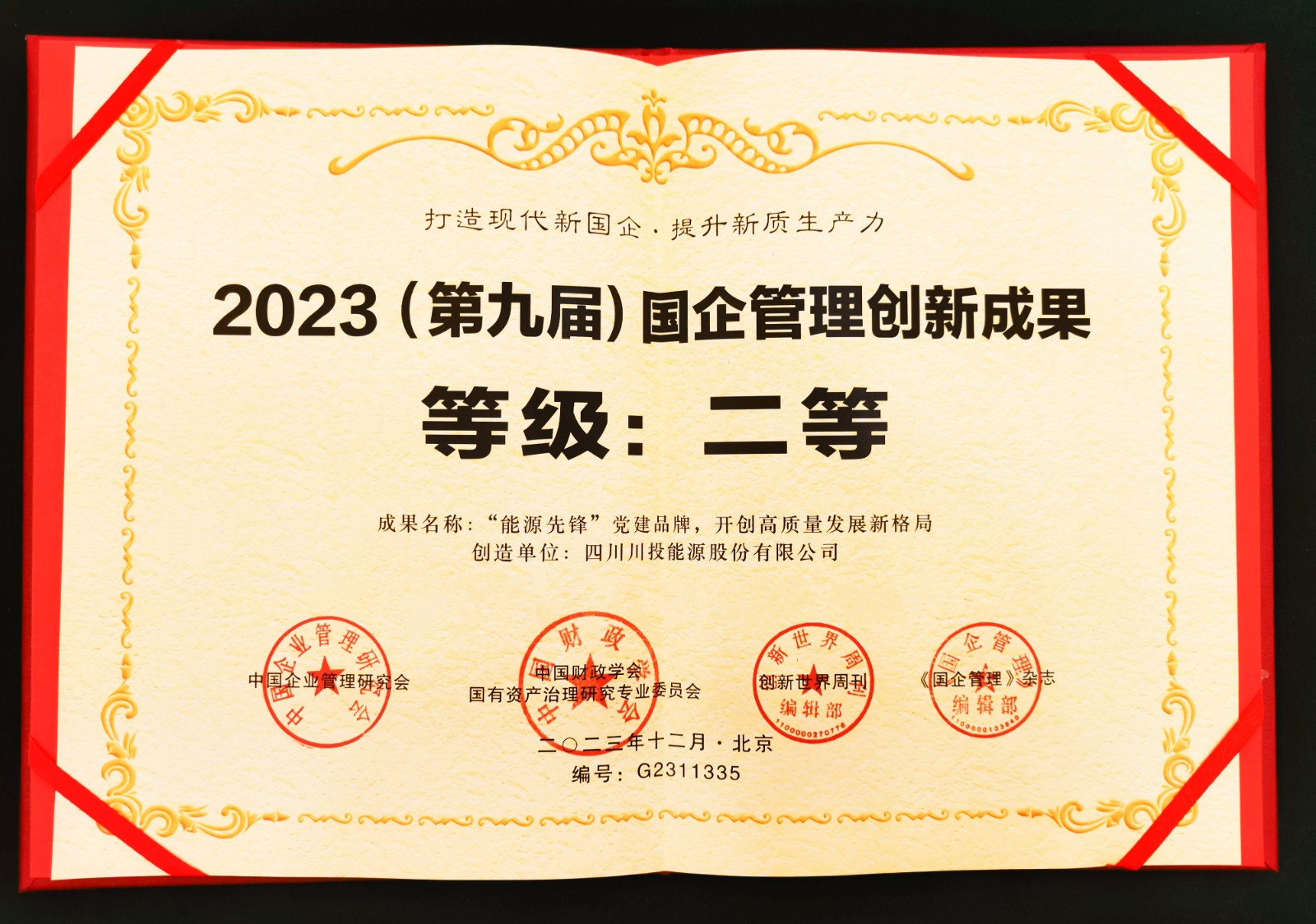 近日,2023(第九屆)國企管理年會暨國企管理創(chuàng)新成果發(fā)布儀式在北京國際會議中心隆重召開。川投能源黨委《“能源先鋒”黨建品牌,開創(chuàng)高質(zhì)量發(fā)展新格局》黨建創(chuàng)新成果(案例)獲評二等獎(jiǎng),并入選《國企管理創(chuàng)新成果年度報(bào)告》。