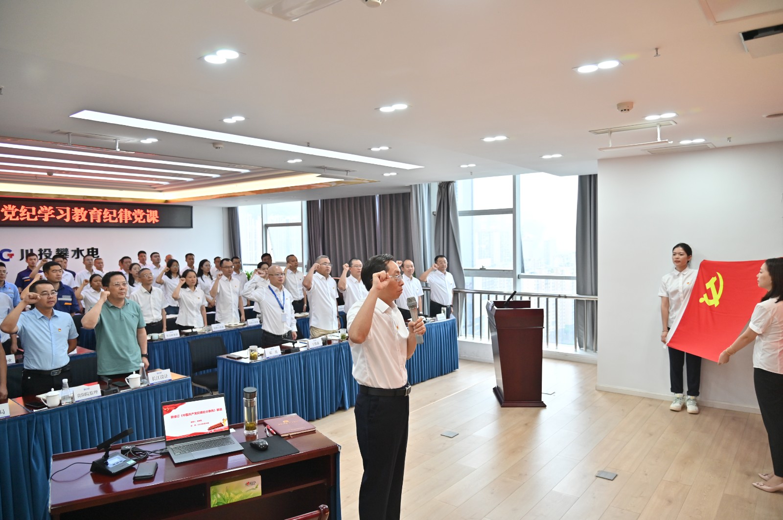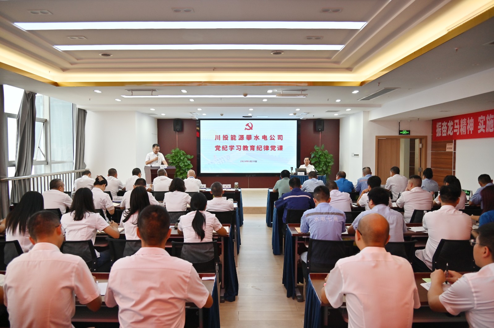 在全黨開展黨紀(jì)學(xué)習(xí)教育和黨的103歲生日來臨之際,按照川投能源黨委和攀水電黨總支的安排部署,6月30日上午,川投能源副總經(jīng)理、攀水電公司黨總支書記、董事長徐孝剛講授了黨紀(jì)學(xué)習(xí)教育紀(jì)律黨課并宣講省委十二屆五次全會精神,公司全體員工、參建單位負(fù)責(zé)人及黨員代表共計50余人參加。