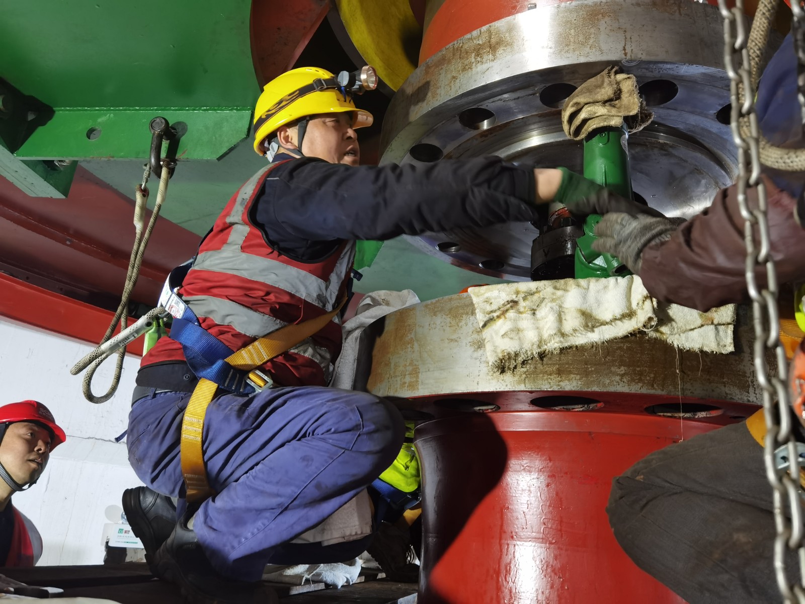 “這‘硬骨頭’我來啃,請組織放心,堅決完成任務”。4月16日,轉(zhuǎn)子回裝過程中,老黨員宋加行發(fā)揚新時代工匠精神,主動承擔高風險、高技術含量的司索崗位,他哨音清晰、手勢果斷,與起重司機配合如“榫卯銜接”。檢修團隊成員分工明確、協(xié)同配合,確保轉(zhuǎn)子回裝工作按期順利完成。