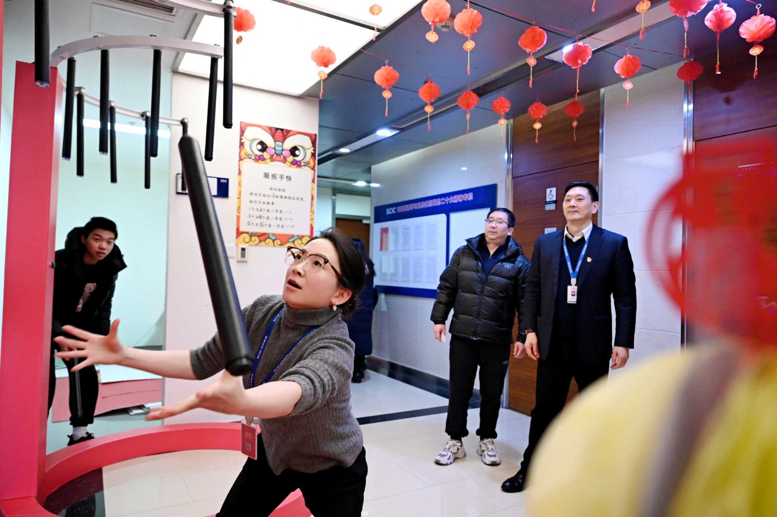 此次活動(dòng)采用游園方式,現(xiàn)場設(shè)置了民俗體驗(yàn)區(qū)、非遺手作區(qū)、民俗體驗(yàn)區(qū)、新春互動(dòng)區(qū)、游戲互動(dòng)區(qū)等5個(gè)活動(dòng)區(qū)域,涵蓋猜燈謎、剪窗花、做龍燈、滾滾樂等8個(gè)活動(dòng)?;顒?dòng)現(xiàn)場每一處都用心裝扮,火紅的中國燈籠、精美的傳統(tǒng)對聯(lián)伴隨濃郁的新年味道彌散在會(huì)場的每一個(gè)角落。大家爭先恐后、玩勁十足,盡享新春的熱鬧與喜悅!有的圍著掛著紅線繩的燈謎卡片,仔細(xì)閱讀謎語,認(rèn)真思考,沉浸在猜謎的樂趣中;有的圍在四川剪紙非遺傳承人莊叢燦老師周圍,一邊聆聽著剪紙的技巧,一邊仔細(xì)修理邊角,用心精雕細(xì)琢;有的在學(xué)習(xí)制作龍燈,他們展現(xiàn)出極高的熱情和創(chuàng)造力,根據(jù)自己的想象,給龍燈增添了各種裝飾,如彩紙、亮片等,使得每個(gè)龍燈都獨(dú)具特色。
