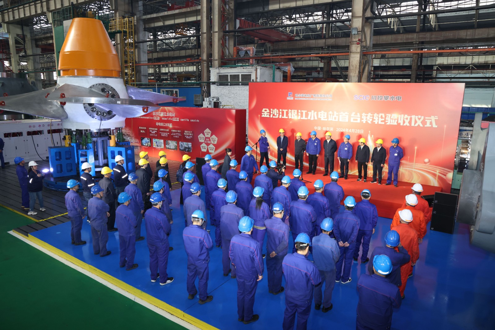 在儀式上,各方聽(tīng)取了轉(zhuǎn)輪研發(fā)設(shè)計(jì)、加工制造及驗(yàn)收情況,對(duì)各項(xiàng)技術(shù)指標(biāo)進(jìn)行了現(xiàn)場(chǎng)檢測(cè),均達(dá)到優(yōu)良,順利通過(guò)驗(yàn)收。王貴對(duì)參加驗(yàn)收的人員表示熱烈歡迎,介紹了哈電集團(tuán)推進(jìn)國(guó)家清潔低碳安全高效能源體系構(gòu)建和“雙碳”戰(zhàn)略目標(biāo),以及近年來(lái)哈電電機(jī)公司在原創(chuàng)技術(shù)策源地、數(shù)字化智能化、產(chǎn)能提升工程建設(shè)方面取得的重大進(jìn)展,并表示川投集團(tuán)與哈電集團(tuán)將以銀江水電站為合作契機(jī),繼續(xù)合力攻堅(jiān)克難、勇攀行業(yè)高峰,推動(dòng)中國(guó)乃至世界清潔能源裝備研發(fā)制造能力邁上新的高度,進(jìn)一步深化務(wù)實(shí)合作,共謀創(chuàng)新發(fā)展,共同努力為促進(jìn)經(jīng)濟(jì)社會(huì)發(fā)展全面綠色轉(zhuǎn)型、為全面建設(shè)社會(huì)主義現(xiàn)代化強(qiáng)國(guó)貢獻(xiàn)力量。