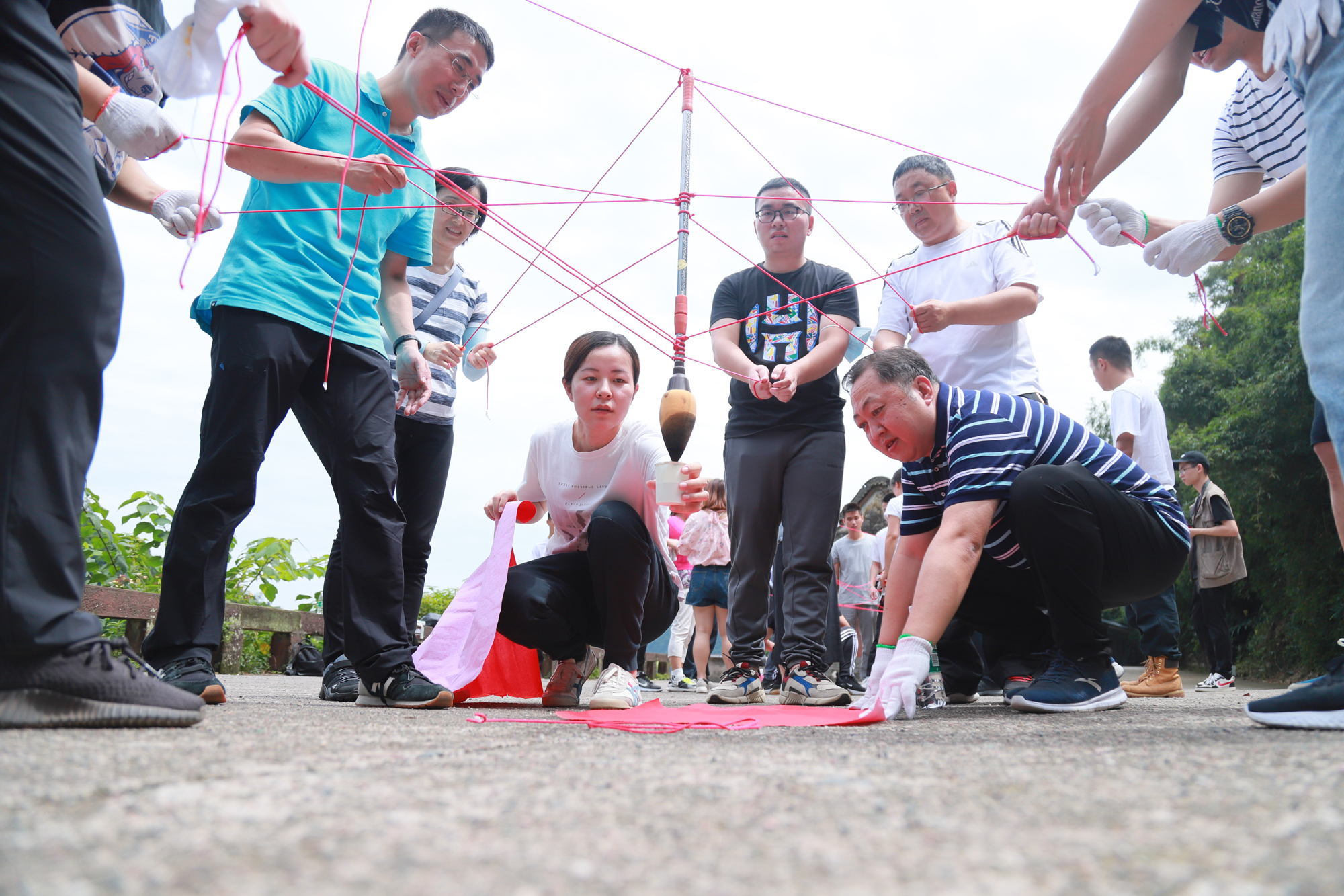 “人心齊,泰山移”。在“書寫傳奇”環(huán)節(jié),小組每個成員拉住綁有大毛筆的繩子末端,通力協(xié)作配合完成指定書寫文字,深刻啟發(fā)大家在工作中不僅要做好崗位工作,恪盡職守,還有學(xué)會合理分工,靈活變通,營造互幫互助、唇亡齒寒的全局觀念,為了團隊目標(biāo)最終達(dá)成及時協(xié)作調(diào)整、鍥而不舍。“流血流汗不流淚,掉皮掉肉不掉隊”。在“飛奪瀘定橋”環(huán)節(jié),教練給各組分發(fā)隊員人數(shù)一半的泡沫墊,要求從起點出發(fā),借助泡沫墊且腳不觸地的情況下,全組隊員“一個都不能少”全數(shù)到達(dá)終點。各小組以斷金碎石的精神,堅定信念,持續(xù)超越;在無障礙溝通的氛圍中感受眾人合力,不斷突破,熔煉團隊。