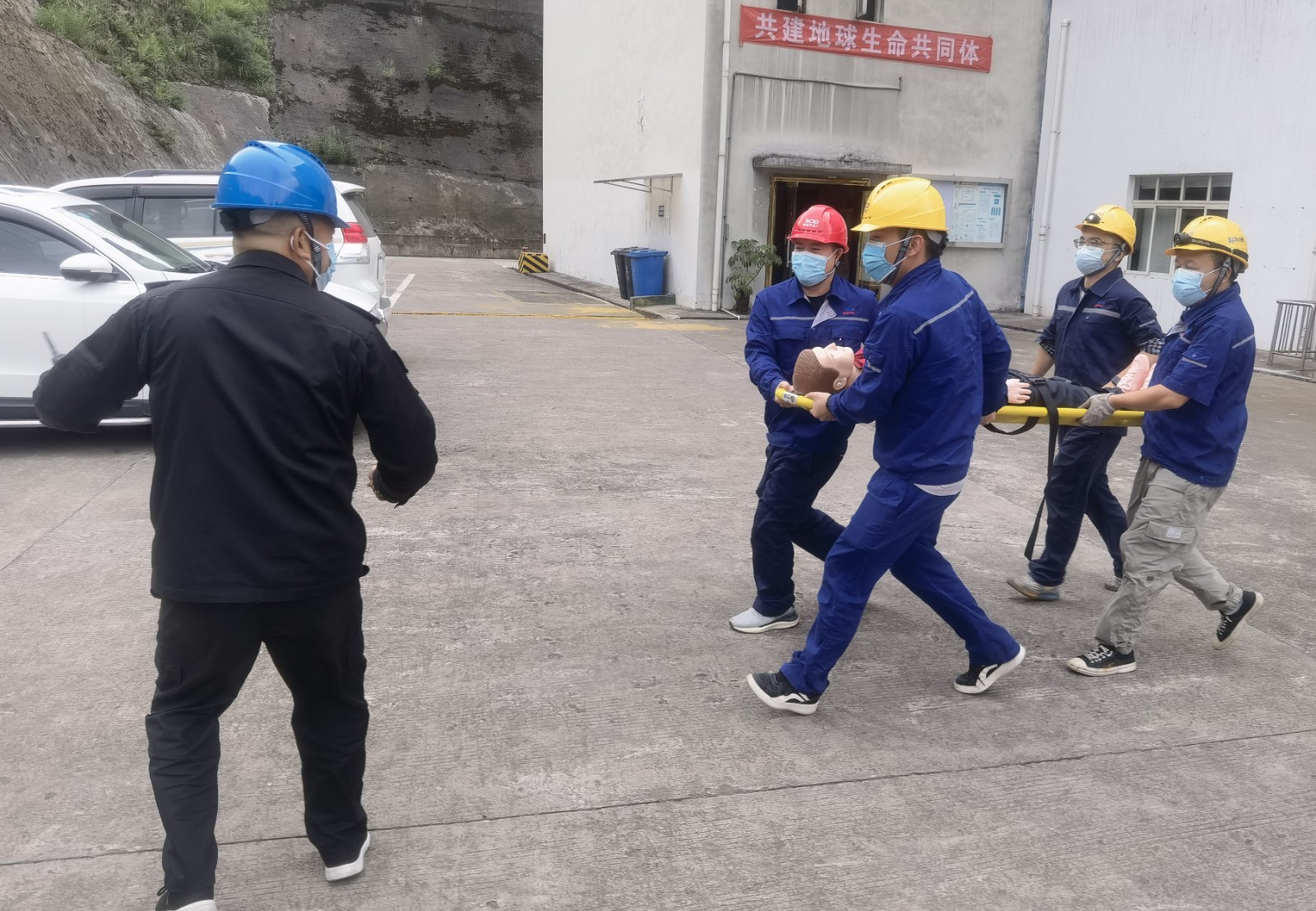 隨著總指揮一聲令下,演練正式開始?!耙幻麊T工突然暈倒,情況不明”,接到指令后,總指揮立即啟動有限空間作業(yè)現(xiàn)場應(yīng)急處置方案,各演練小組攜帶救援設(shè)備迅速到位,穿戴變壓式呼吸機(jī)進(jìn)入集水井將傷員救出,“傷員無外傷、無呼吸、無心跳”救援組對傷員情況作出基本判斷后立即實(shí)施心肺復(fù)蘇急救,用擔(dān)架轉(zhuǎn)移傷員至安全地帶,在119、120到達(dá)事故現(xiàn)場后,傷者移交120。各演練小組協(xié)同119對事故現(xiàn)場進(jìn)行后續(xù)檢查,無次生風(fēng)險。