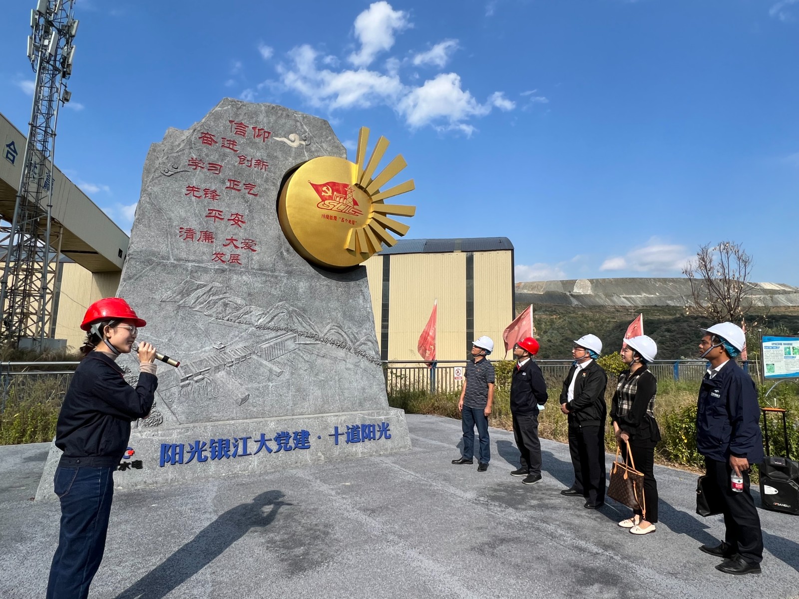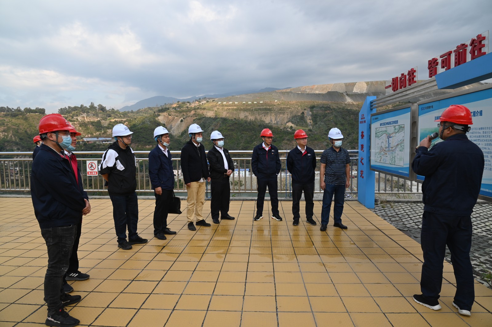 覃鳳荏一行首先來到銀江水電站施工現(xiàn)場,參加了銀江水電站大壩首倉混凝土澆筑活動。在現(xiàn)場聽取了銀江水電站工程整體規(guī)劃、建設(shè)意義、工期計劃等基本情況介紹,并參觀了鋼筋加工車間、試驗室等地。隨后,覃鳳荏一行參觀了攀水電公司“七色陽光大黨建”宣傳陣地,詳細了解了“十道陽光行動計劃”等內(nèi)容。