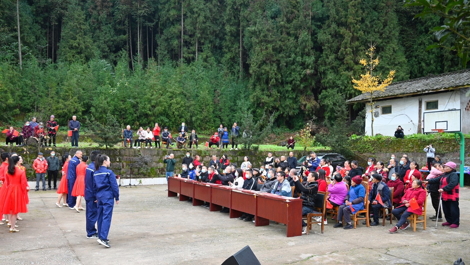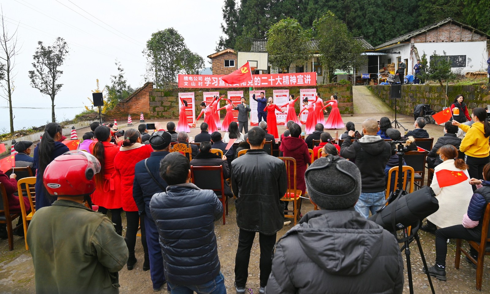 活動(dòng)當(dāng)天,文山村民不顧寒冬凜冽的冷風(fēng),早早來(lái)到現(xiàn)場(chǎng)等待。在音樂(lè)快板《向著第二個(gè)百年奮斗目標(biāo),前進(jìn)!》中拉開了宣講活動(dòng)的序幕,村民們?cè)诟挥懈腥玖Φ目彀迓曋?,再一次重溫了黨的二十大精神要點(diǎn),文山村民表演的擁軍花鼓和快板《二十大精神譜新篇》讓大家對(duì)中國(guó)共產(chǎn)黨為解放全中國(guó)所付出的犧牲和努力,心懷感激,并對(duì)美好的未來(lái)生活充滿無(wú)限期待。最后,全體宣講隊(duì)員用一曲歌伴舞《領(lǐng)航》將此次表演推向了高潮。全體村民為宣講隊(duì)員精彩的演出熱烈鼓掌,也為這場(chǎng)走進(jìn)鄉(xiāng)村的宣講活動(dòng)畫上了圓滿的句號(hào)。