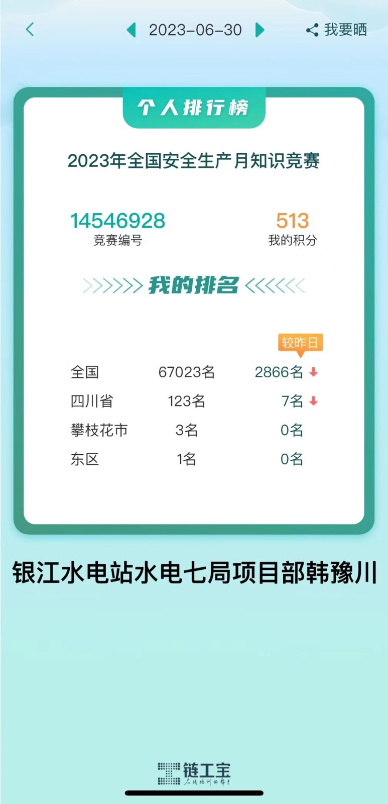 在“鏈工寶”2023年全國安全生產(chǎn)月知識競賽活動中,攀枝花市前10名中,銀江水電站占3人,東區(qū)前10名中,銀江水電站占6人,有效檢驗了安全生產(chǎn)月活動成果,充分體現(xiàn)了銀江水電站學安全、講安全的濃厚安全生產(chǎn)氛圍,進一步強化了廣大工程參建人員的安全生產(chǎn)意識。