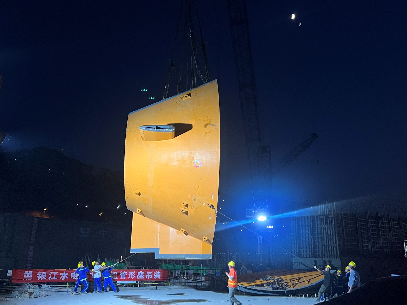 10月21日,在熱火朝天的銀江水電站建設(shè)工地,重達(dá)75噸的首臺機組管形座第一瓣內(nèi)殼在400t重型履帶吊車的吊裝下順利到位,標(biāo)志著銀江水電站工程建設(shè)全面進入到機組安裝階段。