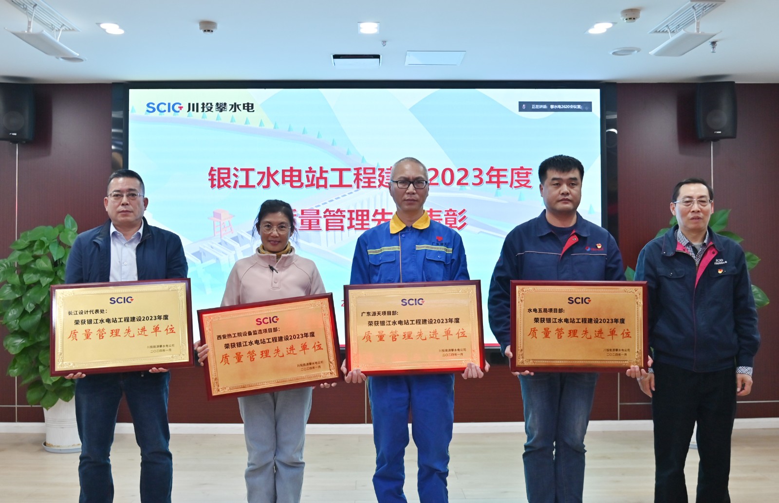 會上,公司副總經(jīng)理唐伽宣讀了《關(guān)于表彰銀江水電站2023年度質(zhì)量管理先進單位、先進集體和先進個人的通報》文件,徐孝剛向榮獲2023年度質(zhì)量管理先進單位的長江設(shè)計代表處、西安熱工院設(shè)備監(jiān)造項目部、水電五局項目部、廣東源天項目部頒發(fā)了獎牌;公司黨總支副書記、董事會秘書、工會主席鄧勇,公司黨總支委員、紀檢小組長楊銳向榮獲先進集體的長江設(shè)計代表處壩工專業(yè)組、貴陽院監(jiān)理部土建工程管理部、西安熱工院設(shè)備監(jiān)造項目部駐哈電監(jiān)造站、水電七局項目部砂石工區(qū)、水電五局項目部土建三隊、廣東源天項目部主機班等13個集體頒發(fā)了獎牌。徐孝剛向獲獎的單位、集體及個人表示了祝賀,要求他們在今后的質(zhì)量管理工作中發(fā)揮好先鋒模范帶頭作用,促進各參建單位共同提高質(zhì)量管理水平,把銀江水電站建設(shè)成“精品工程、樣板工程、陽光工程”。
