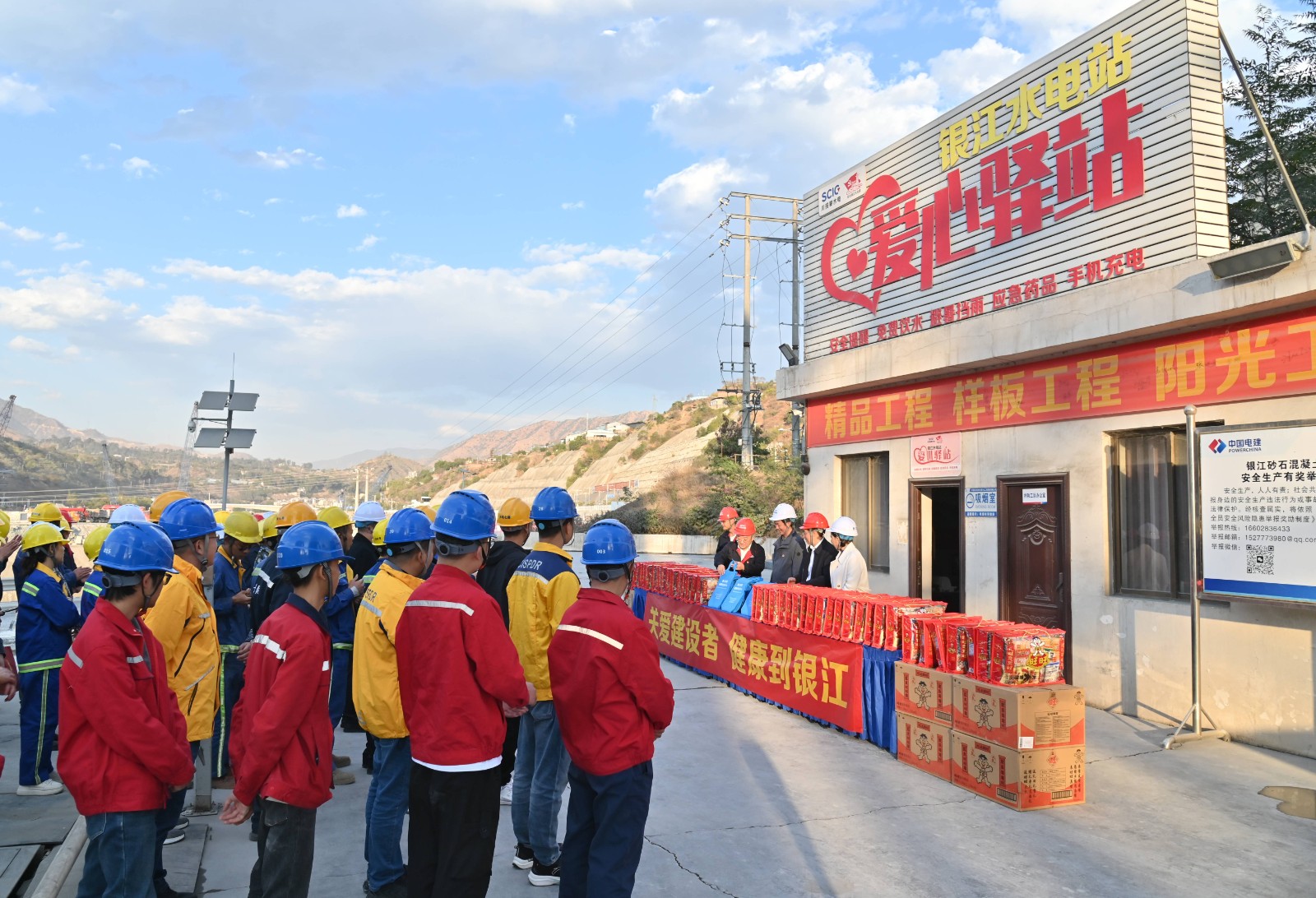 活動(dòng)首先參觀了公司大黨建宣傳陣地和銀江水電站施工現(xiàn)場(chǎng)。在愛心驛站,黨員們?yōu)閬碜蚤L(zhǎng)江設(shè)計(jì)院、貴陽(yáng)院監(jiān)理部、水電五局項(xiàng)目部、水電七局項(xiàng)目部、廣東源天項(xiàng)目部等參建單位的工友發(fā)放了健康宣傳手冊(cè)、新春大禮包等慰問物品。田巨龍感慨到銀江水電站工程建設(shè)速度之快難以令人想象,囑咐工友們一定要保重身體、注意自身防護(hù),祝福工友們平平安安、健健康康迎接新年的到來。