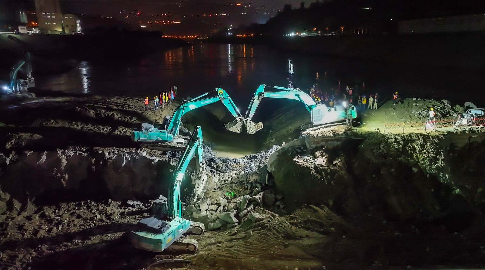 金秋十月,川投能源銀江水電站工程建設“進度條”持續(xù)刷新。10月25日晚上,隨著川投能源副總經理、導流明渠截流指揮長徐孝剛一聲令下,十余臺挖掘機在二期上游圍堰右岸進行破口開挖,奔騰的金沙江水隨即涌入主河床廠房與溢流壩上游,充水平壓后江水經溢流壩段流向下游,銀江水電站成功實現分流。這一重要進展為按期完成導流明渠截流打下堅實基礎,也標志著銀江水電站首臺機組投產發(fā)電正式進入倒計時階段。