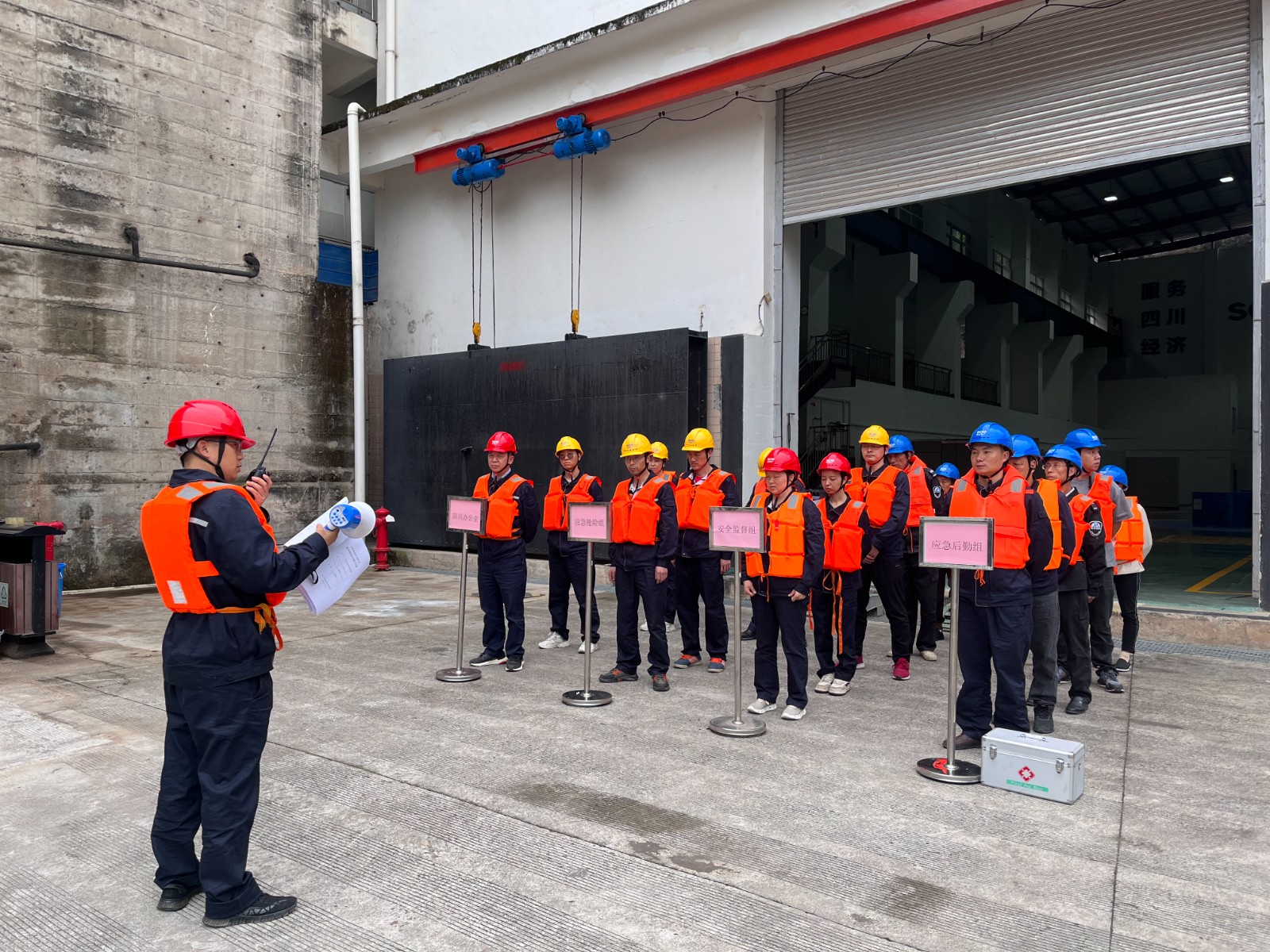 演練前,電廠組織全員學習了《玉田電廠2025年防洪度汛應(yīng)急演練方案》,演練于14時30分正式開始,模擬玉田電廠三臺機組帶負荷93MW,越西縣氣象部門發(fā)布暴雨橙色預警,越西縣降暴雨已持續(xù)數(shù)小時。上游宏陽電站和團結(jié)電站準備停機避峰已開閘放水,尼日河道來水兇猛,預計來水流量達到800m3/s,閘首水位1274.5m的緊急情況。當值值長接到汛情后,迅速匯報防汛辦負責人。防汛辦負責人要求控制好水位,確保人員安全,并準備停機避峰。隨后,險情立即上報至防汛總指揮,總指揮接到險情后,立即啟動《玉田電廠防汛搶險應(yīng)急預案》,成立現(xiàn)場指揮部,統(tǒng)籌調(diào)度防汛辦公室、安全督導組、應(yīng)急搶險組、應(yīng)急后勤組等多支隊伍。大壩值班人員接到通知后拉響防洪警報,開啟沖砂閘和泄洪閘緩慢放水,控制水位,同時做好防汛物資準備,并啟動柴油發(fā)電機。當班值長向調(diào)度申請停機避峰,并及時向相關(guān)部門及下游電站通報汛情。三臺機組停機后,逐步開啟沖砂閘和泄洪閘進行泄洪。應(yīng)急搶險組完成了廠房柴油發(fā)電機啟動試驗,落下機組尾水閘門,關(guān)閉主廠房防洪門并堆砌防洪沙袋。運行值班人員加強設(shè)備和邊坡巡查。后勤組負責人員疏散和后勤保障工作。各小組協(xié)同作戰(zhàn),演練于15時49分圓滿結(jié)束。