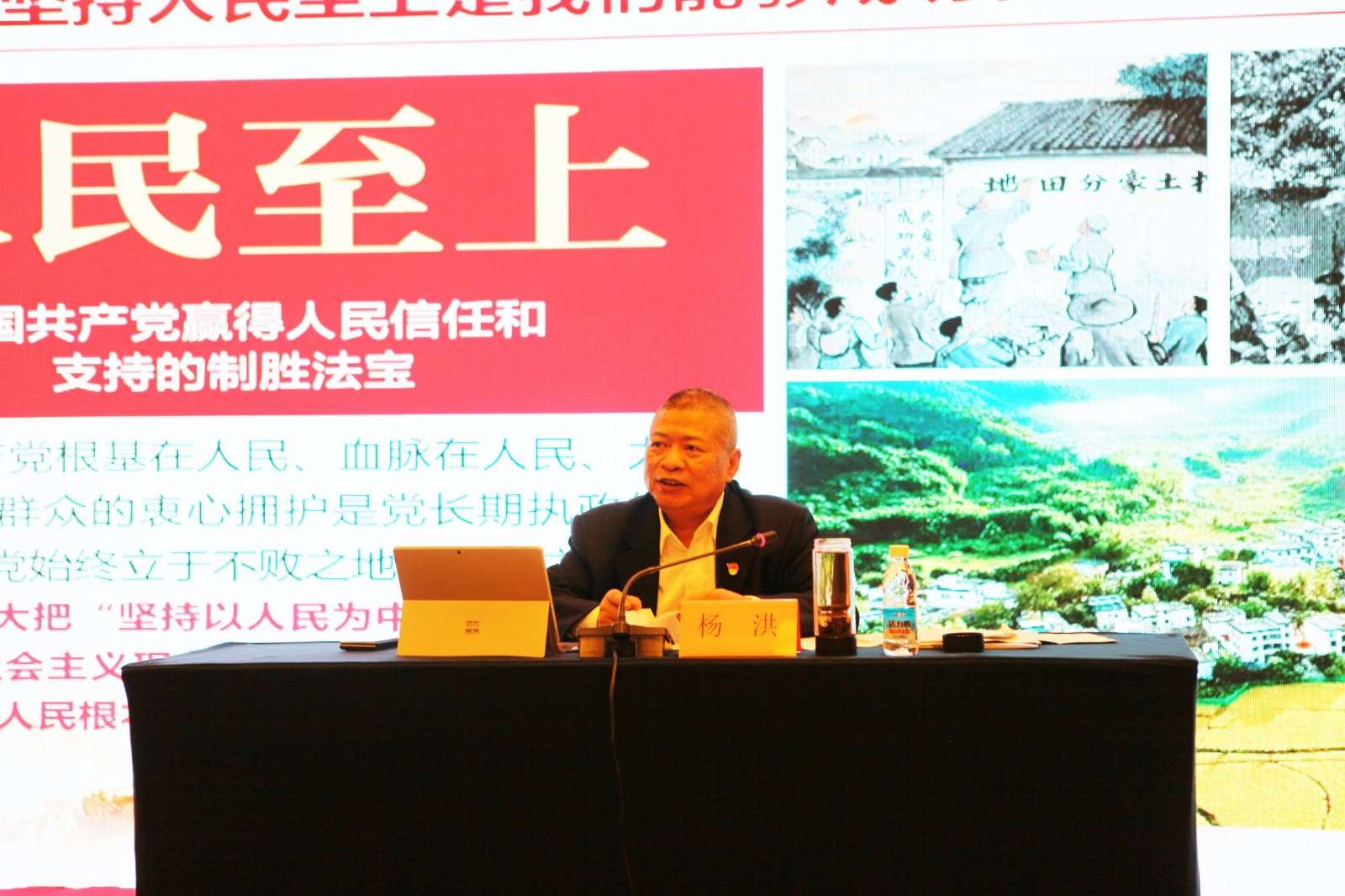 楊洪以《學(xué)習(xí)黨的歷史決議,汲取黨的歷史經(jīng)驗(yàn),以強(qiáng)烈的歷史主動(dòng)精神推動(dòng)高質(zhì)量發(fā)展》為題,圍繞黨的三個(gè)歷史決議的制定背景、主要內(nèi)容、邏輯關(guān)系、戰(zhàn)略價(jià)值等方面講授“開班第一課”。他指出,重視歷史、借鑒歷史,是我們黨在長(zhǎng)期實(shí)踐中形成的優(yōu)良傳統(tǒng)和政治優(yōu)勢(shì)。他強(qiáng)調(diào),黨的三個(gè)歷史決議深刻揭示了黨的歷史發(fā)展的主題主線、主流本質(zhì)、規(guī)律認(rèn)識(shí),廣大黨員干部要深入學(xué)習(xí)、融會(huì)貫通,特別是對(duì)黨的第三個(gè)決議關(guān)于“十個(gè)堅(jiān)持”的歷史經(jīng)驗(yàn)總結(jié)要倍加珍惜、始終堅(jiān)持,不斷堅(jiān)定歷史自信、把握歷史規(guī)律、掌握歷史主動(dòng),把學(xué)習(xí)成效轉(zhuǎn)化為干事創(chuàng)業(yè)的動(dòng)力,在新的趕考之路上跑出加速度、創(chuàng)造新輝煌。